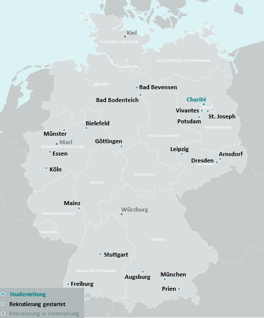 Bitte achten Sie darauf, dass derzeit noch nicht alle Zentren Familien in die Studie aufnehmen. Die Karte gibt Ihnen einen Überblick über die Zentren, die bereits mit dem Einschluss begonnen haben.